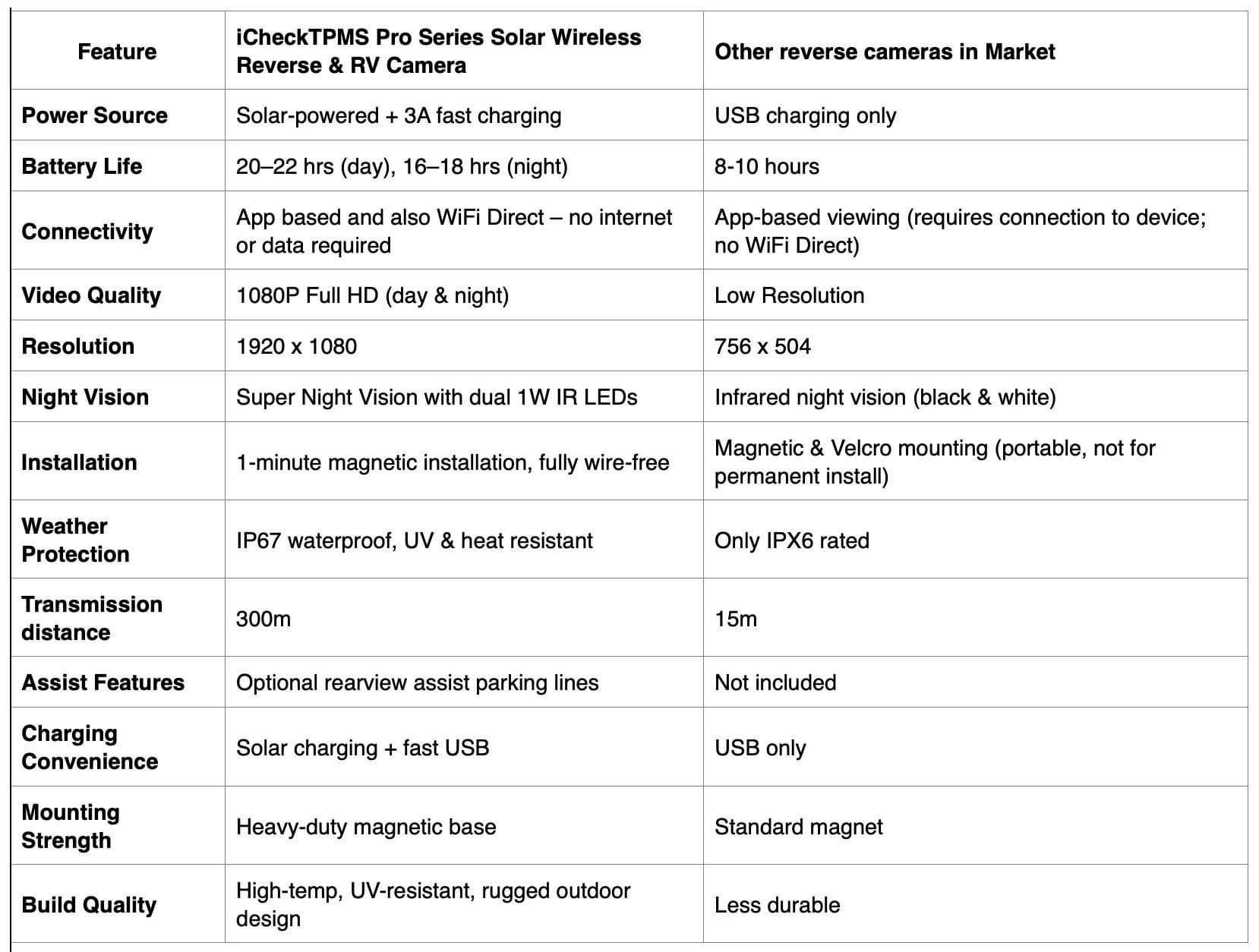 The iCheckTPMS Pro Series Solar Wireless Reverse & RV Security Camera sets a new benchmark for reliability, clarity, and convenience. With cutting-edge WiFi Direct, efficient solar charging, and a 1-minute magnetic installation, it delivers unmatched performance without wiring, networks, or data plans.